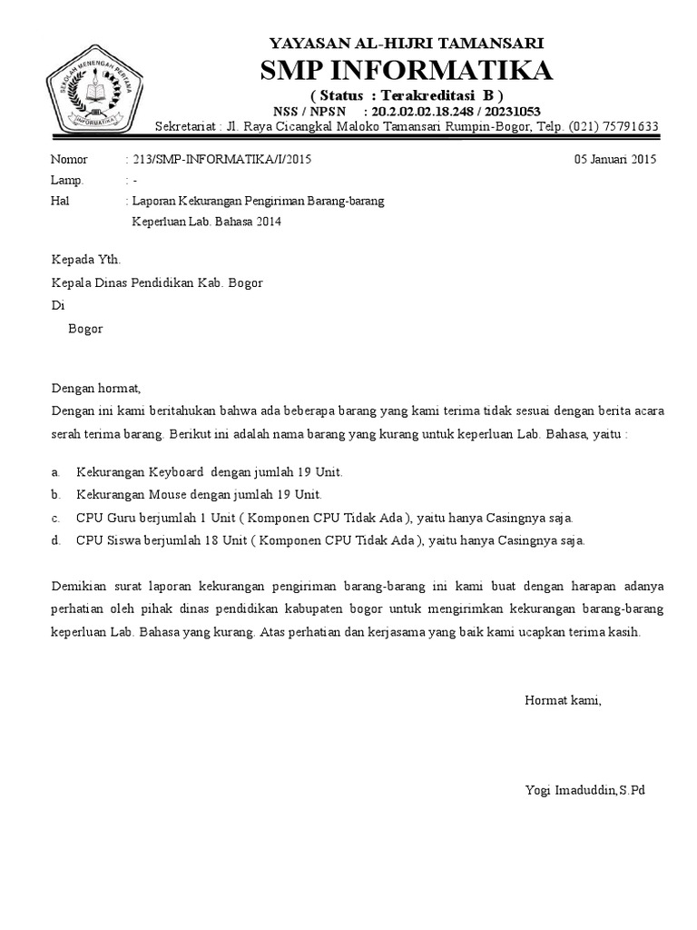 Contoh Surat Menyerahkan Barang